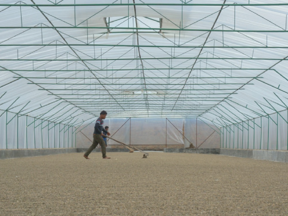 集まったGABAは、パーチメントを取り除かれグリーンコーヒーとなり、屋根つきの乾燥場でスマトラ式独特のエメラルドグリーンビーンズに仕上げられていきます。ここインドネシアでは、一年中降水量も多く、急激な天候の変化もあるためか、その独特なスマトラ式と言われる生産処理方式が確立されました。ムンテ氏はこの気候に対応するために、インドネシアでは珍しいハウス乾燥場を建設し、品質の向上を目指します。